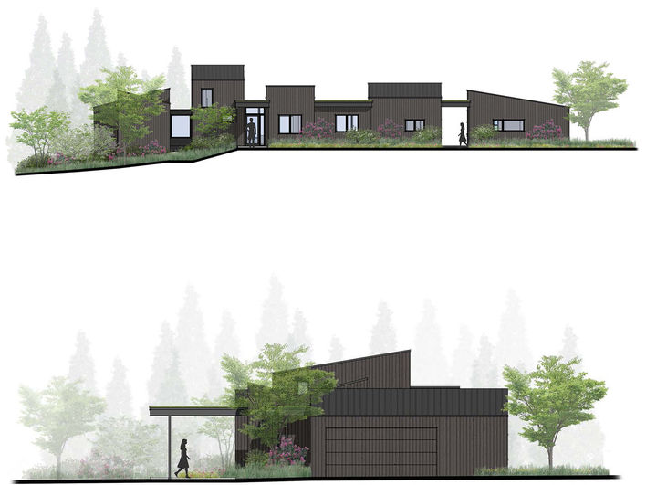 The composition of this custom home in Camas, WA is inspired by the shapes and relationships between tree stands, snags, and the surrounding meadow and wetlands of the site.